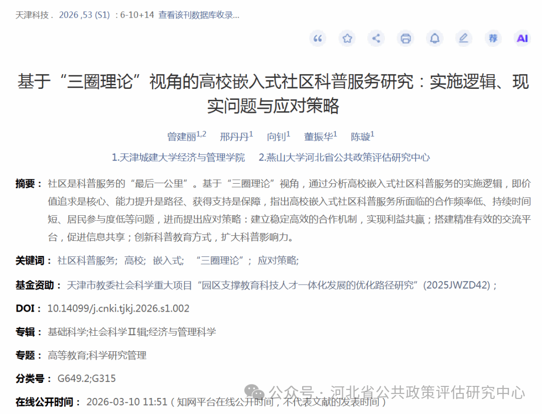 近日,我智库核心专家、天津城建大学经济与管理学院曾建丽博士署名我智库发表在《天津科技》发表论文:基于“三圈理论”视角的高校嵌入式社区科普服务研究:实施逻辑、现实问题与应对策略。该文认为: