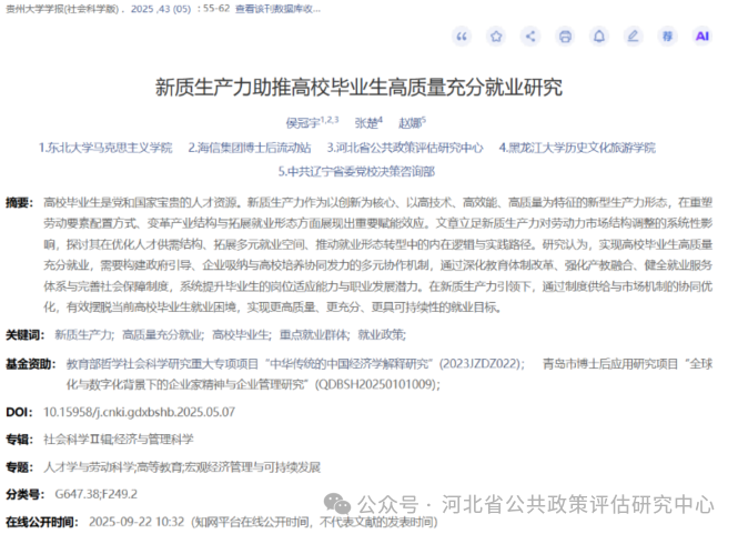 近日,我智库核心专家侯冠宇博士在CSSCI期刊《贵州大学学报(社会科学版)》发表论文“新质生产力助推高校毕业生高质量充分就业研究”,该文认为: